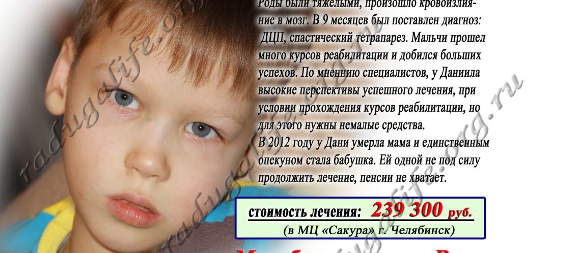 Дане 9 лет, живет он вместе со своей бабушкой и это вся их маленькая семья — мама Даниила умерла в 2012 году, а отец ограничен в родительских правах и в жизни сына не принимает никакого участия. Родился мальчик на 35-36 неделе беременности, во время тяжелых родов у него было сломано плечо, произошло кровоизлияние в мозг — жизнь ему спасли в реанимации, еще месяц он оставался в больнице. В 9 месяцев малышу был поставлен диагноз: ДЦП, спастический тетрапарез, ЗПР. Даня прошел множество курсов реабилитации в различных городах и в его развитии наблюдается положительная динамика. Сам он пока не ходит, но, если …