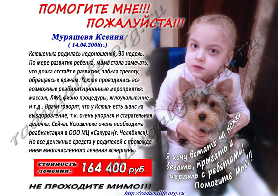 Для оплаты лечения Ксюши требуется 164.400 рублей. Девочка отстает в развитии: интеллект, к счастью, сохранен, но она пока что не может самостоятельно ходить, только начинает осваивать речь. Однако в её состоянии есть очевидный прогресс, врачи положительно оценивают перспективы на выздоровление — при должном лечении Ксюша сможет и ходить и разговаривать. Давайте постараемся помочь ей в этом! СБОР ЗАКОНЧЕН Документы Письмо-обращение Свидетельство о рождении Счет 1 2 3 4