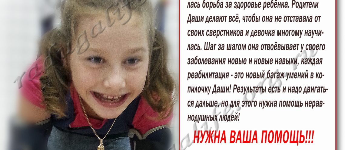 Даше 9 лет. Для оплаты её лечения требуется 110.000 рублей. Намеченный курс реабилитации для Даши далеко не первый — девочка лечилась в десятке с лишним клиник, а в некоторых из них бывала неоднократно. Но за помощью её родители обращаются впервые. К нам, в фонд «Радуга жизни», обратилась мама девочки, Ольга. Вот что она рассказала в своем письме о заболевании Даши и о её продолжительном лечении. Даша родилась недоношенной, на сроке 31-32 недели. В 1.5 месяца ей сделали УЗИ головного мозга и поставили диагноз: перивентрикулярная кистозная лейкомаляция и как следствие — ДЦП в тяжелой форме. С этого дня у нас начался …