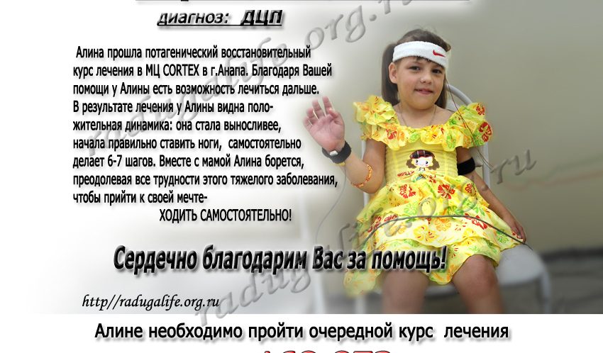 8-летняя Алина родилась недоношенным, нежизнеспособным ребёнком, и в возрасте 1 года ей были поставлены неутешительные диагнозы: ДЦП, спастический тетрапарез, задержка психомоторного развития, аллергия. Девочка нуждается в дорогостоящем специализированном лечении. _______________________________________________ В настоящее время Алина ожидает возможности начать третий курс лечения в клинике CORTEX (г. Анапа). Его стоимость — 168.872 рубля (соответствующие документы добавлены ниже). Предыдущий курс заметно улучшил состояние девочки, лечение даёт свои плоды. Об этих успехах мы сообщали в РАЗДЕЛЕ НОВОСТЕЙ, где публиковали письмо мамы Алины с рассказом о состоянии дочки и с благодарностями всем нашим жертвователям. Просим вас присоединиться к сбору средств! Путь Алины и её родителей очень …