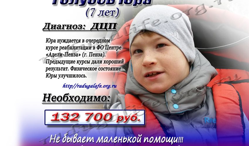 Юре Голубеву 7 лет, мальчику поставлен тяжелый диагноз — ДЦП, спастический тетрапарез. Фонд «Радуга жизни» уже пробоводил сбор средств, благодаря которым в апреле 2015 года Юра прошел необходимый курс реабилитации в оздоровительном центре «Адели» (г. Пенза). Сейчас мальчик нуждается в новом курсе лечения, запланированном в той же клинике. Для оплаты счета требуется 132.700 рублей. Мы просим Вас помочь Юре и его маме, которая одна воспитывает сына, и принять участие в сборе необходимой суммы! СБОР ЗАКОНЧЕН Документы Свидетельство о рождении Справка об инвалидности Выписка 1 Вып. 2 Вып. 3 Вып. 4 Вып. 5 Вып. 6 Инфокарта 1 Инфокарта 2 …