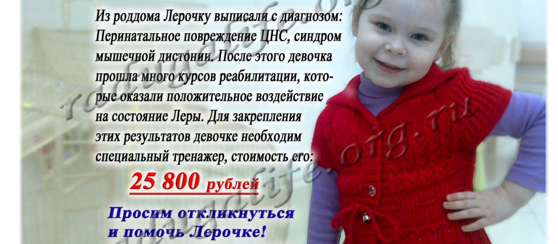 Благодаря серии оздоровительных курсов состояние Леры заметно улучшилось: сейчас она способна брать предметы в руки, начинает осваивать речь. Для закрепления этих результатов и дальнейшего улучшения состояния девочки, ей необходим домашний многофункциональный тренажер. Его стоимость — 25.800 рублей. Уважаемые друзья! Все те, кто жертвует на благотворительность, те, кто уже принимал участие в судьбе Леры! Вместе с вами мы сумели помочь девочке с лечением и прогресс очевиден. Давайте сделаем еще один шаг! СБОР ЗАКОНЧЕН Лере 2,5 года, у неё диагностирован ДЦП, спастический гемипарез справа. К сожалению, столь серьезные проблемы со здоровьем были выявлены далеко не сразу. Тревожные симптомы наблюдались с …